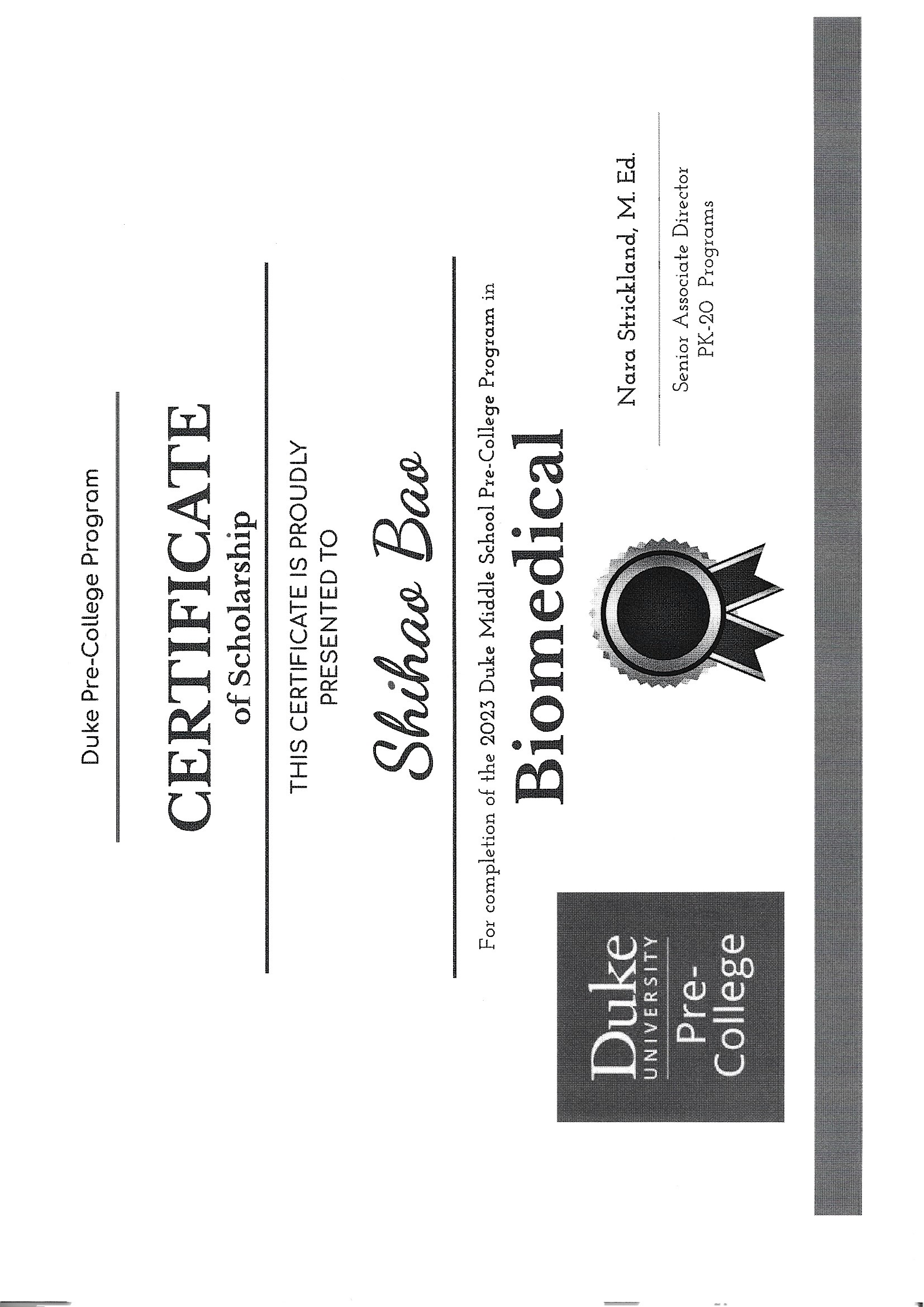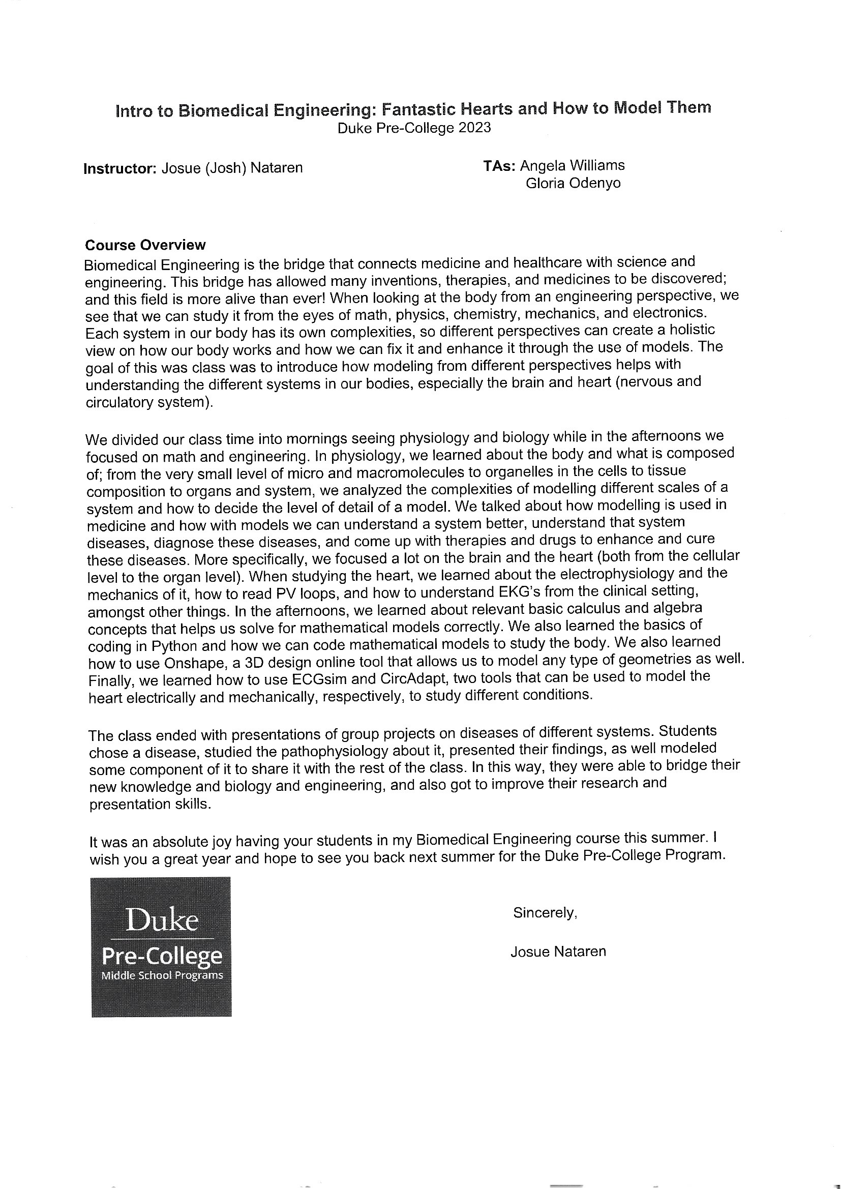 2023 Duke Pre-College Programs Biomedical Engineering: Fantastic Hearts Certificate of Scholarship