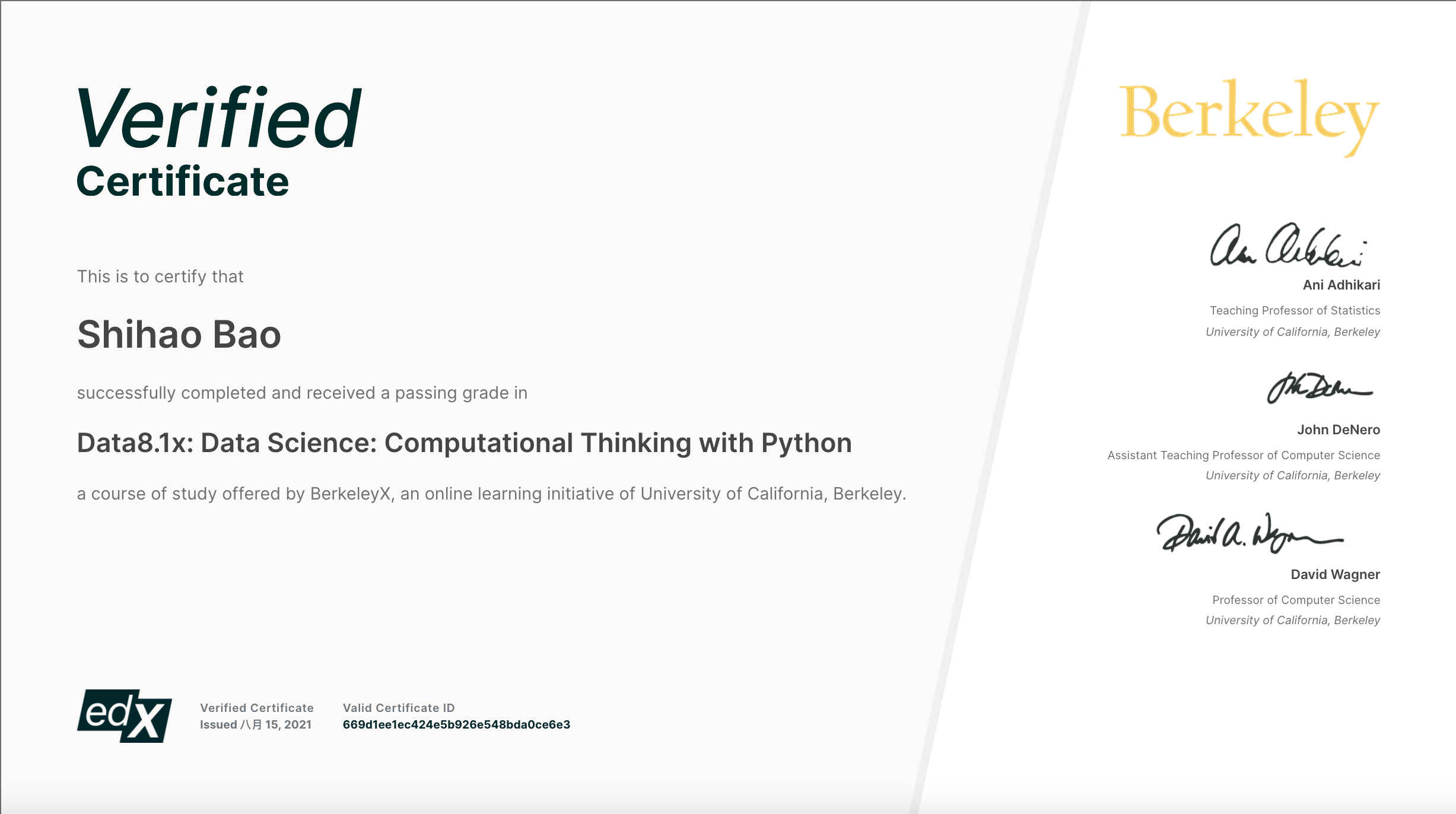 I finished the UC Berkeley Data8.1x: Data Science: Computational Thinking with Python course on EDx