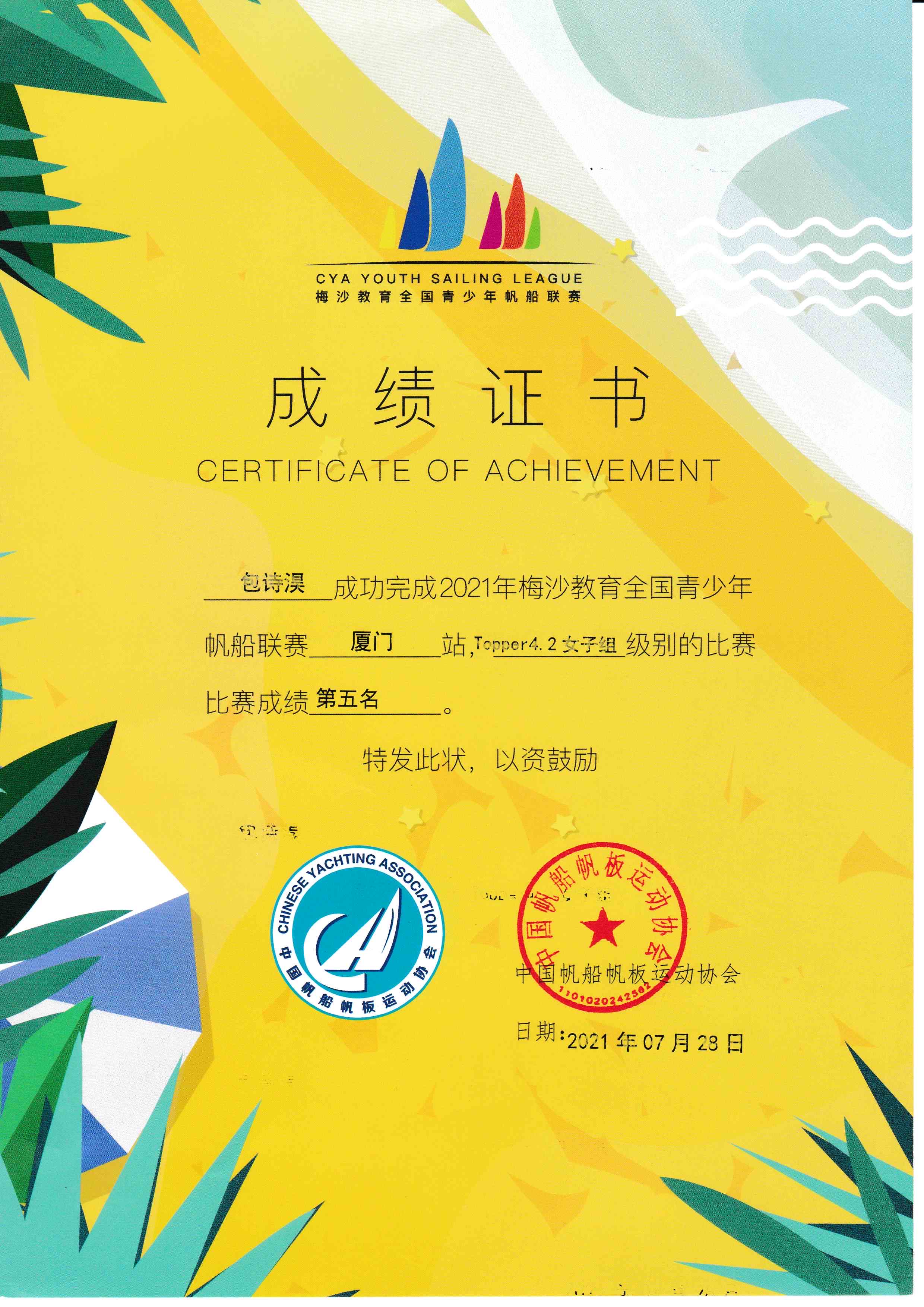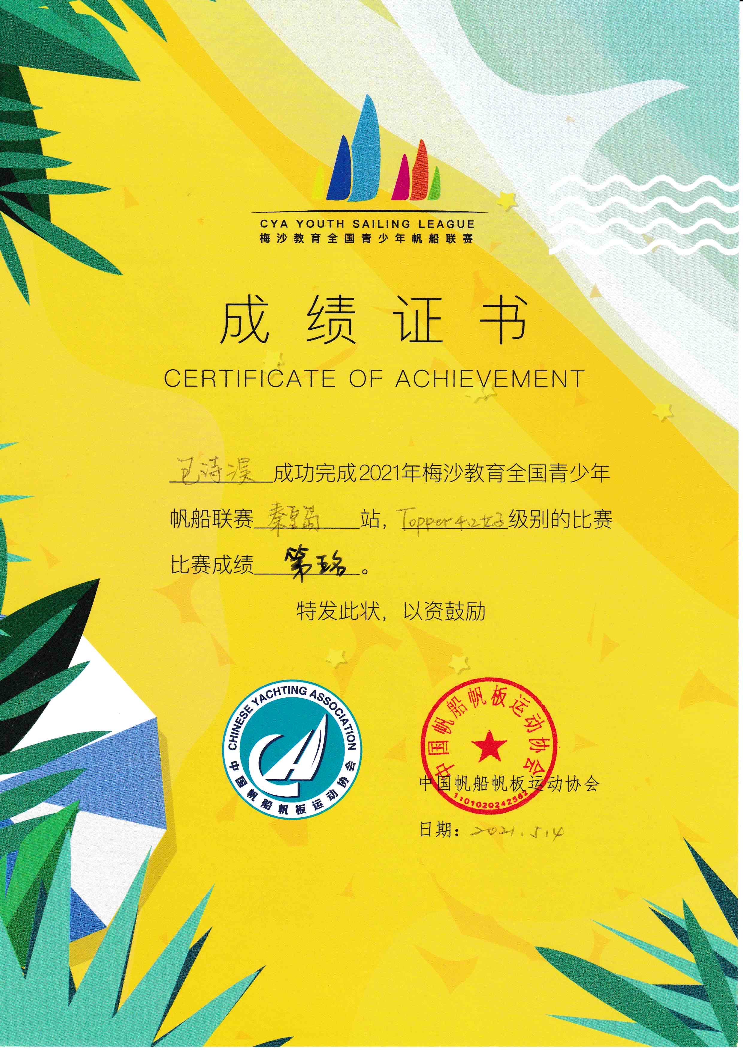Two times China National Youth Sailing Tournament Topper4.2 - Fifth Place
