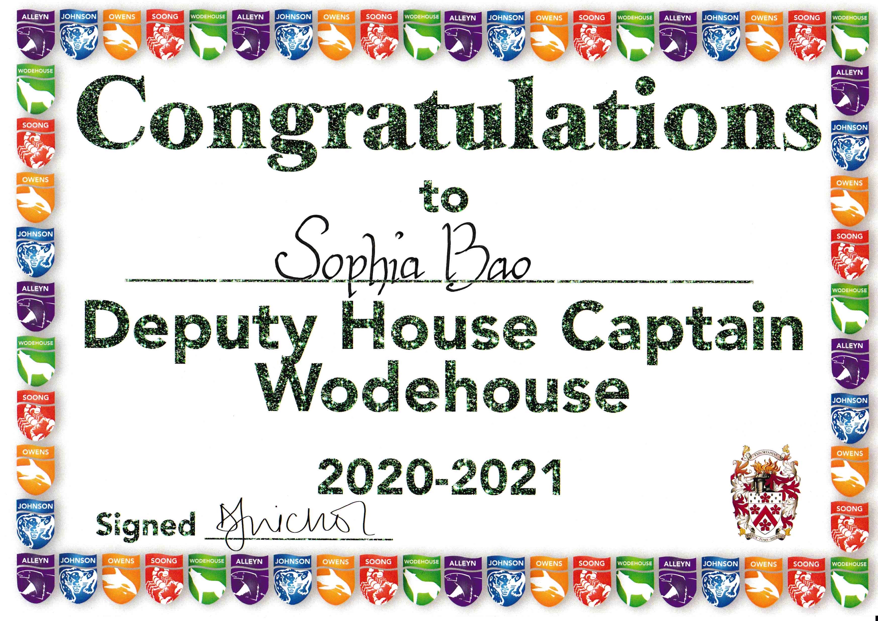 2020-2021 Junior School Woodhouse Deputy-House Captain: Lead House events, Sports activities, Early years sports events, etc. Initiated the effective procedure to make sure everyone wears a mask at school time as the duty of House Captain during the outbreak of COVID-19